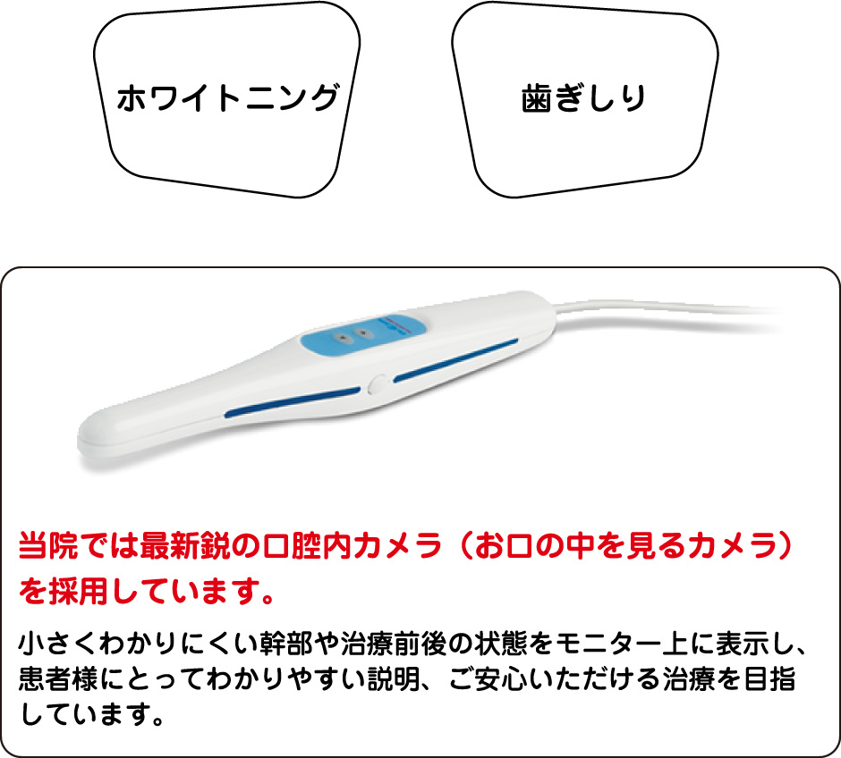 主に虫歯や歯周病などの治療を行います。患者様の歯の状態を把握するため、十分なカウンセリングや検査をさせていただいた上で、治療方針をご納得いただけるよう丁寧にご説明いたします。また、できるだけ痛みが少なく、できる限り歯を削らない治療を心がけています。